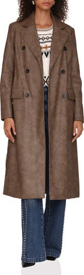 Elevate your outerwear portfolio with this longline faux-leather coat featuring double-breasted construction and a slim waist tie.