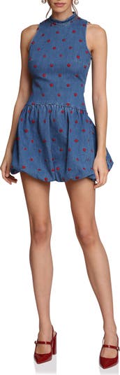 A party-pretty denim dress is textured with tiny heart embroidery and set with a bubbly hem.