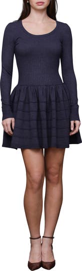 Ribbing visually elongates as it skims the waist on this skater-style sweater-dress—a versatile addition to the simple and chic section of your wardrobe.