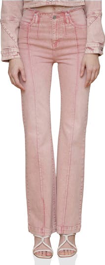 A raw waistband tops these artfully washed flare pants with pintuck detailing down the front.