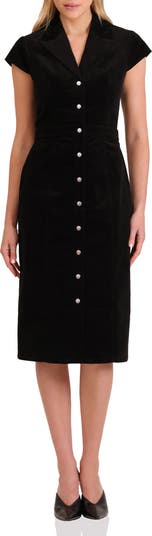 This mid-length corduroy dress features cap sleeves, a notch collar and a front button closure while princess seams and a soft A-line silhouette add flattering structure.