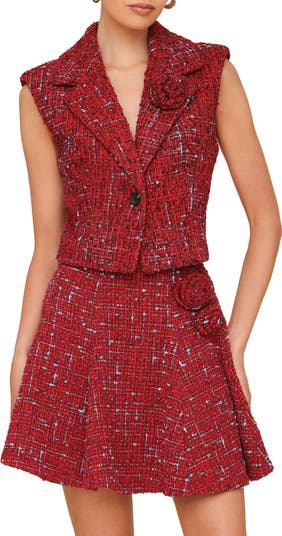 Extended shoulders structure a bright and nubby tweed vest accented with a rosette on the lapel for a chic finish.