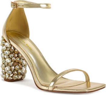 Faceted jewels make a glam statement on the block heel of a minimalist square-toe sandal secured with an adjustable strap at the ankle.