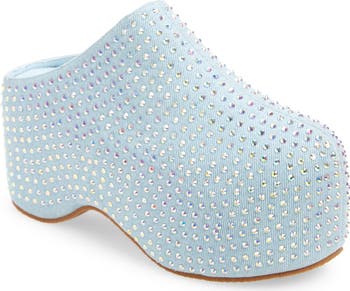 A powerful platform boosts you skyward in this modern clog featuring a crystal-covered denim upper.