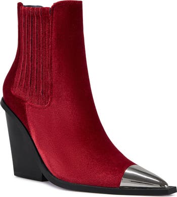A richly textured upper and polished metallic pointy toe beautifully balance both Western and modern styling in this captivating boot that will be a showstopper for both casual and elegant outings.