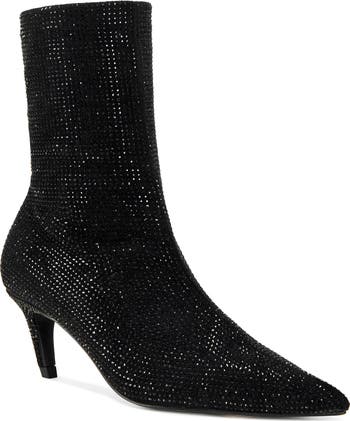 Allover crystals add shimmering glamour to a pointy-toe bootie that's destined to steal the scene.