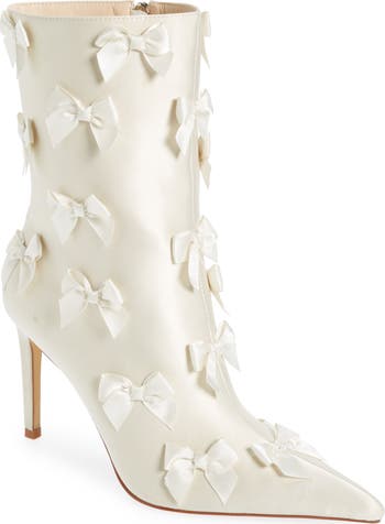 Charming bows lend modern elegance to a luxe satin bootie framed by a pointy toe and slender heel.