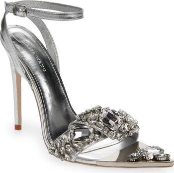 Sparkling crystals make a dazzling statement on a stiletto sandal topped with a slim ankle strap.
