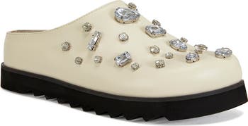 Faceted jewel embellishments elevate the upper of a luxe mule lifted by a subtle platform and durable sawtooth sole.