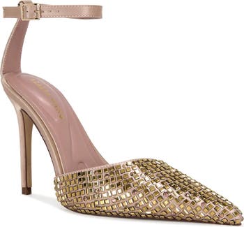 A crystal-encrusted pointy toe intensifies the modern glamour of a stiletto pump topped with a slim ankle strap.