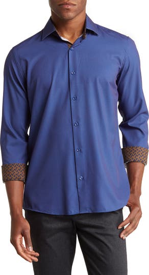 A wrinkle-free performance fabric defines this slim fit dress shirt covered in a geometric print, making it a great choice for a well-dressed look.