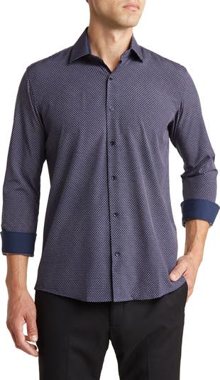 A wrinkle-free performance fabric defines this slim fit dress shirt covered in a geometric print, making it a great choice for a well-dressed look.