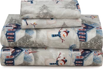 Bring holiday cheer into your bedroom with this cotton-flannel sheet set patterned with smiling snowmen in a winter wonderland.