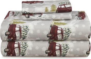 Bring the holiday spirit into your bedroom with this cotton-flannel sheet set covered with retro cars transporting Christmas trees.