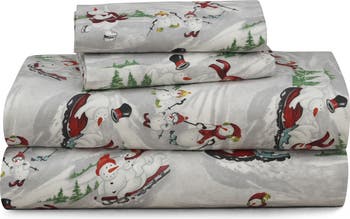 Make your bedroom a cozy retreat with this softly brushed cotton-flannel sheet set featuring a winter-inspired print to complete your holiday decor.