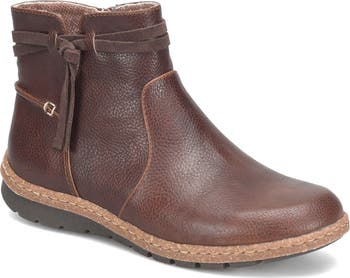 Pebbled faux leather crafts a side-zip bootie fitted with a cushioned footbed and braided details for added flair.