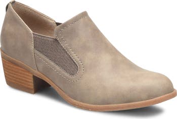 Dual elastic goring brings stretchy comfort to this slip-on bootie elevated by an angled heel.