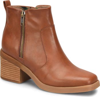 A stacked block heel uplifts a zipper-trimmed bootie with a square-toe silhouette for a contemporary finish.