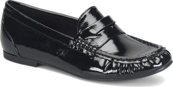 A classic penny keeper and an apron toe lend timeless sophistication to a glossy faux-leather loafer that will elevate your polished style.