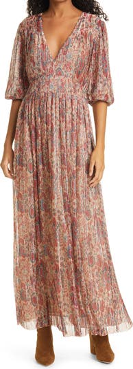 This long and flowy dress is covered in a beautiful floral print that dances in the light with metallic thread streaks.