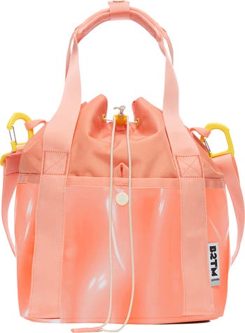 Perfect for any day trip, this small yet spacious bucket bag is outfitted with top handles and an optional strap for versatile carrying.