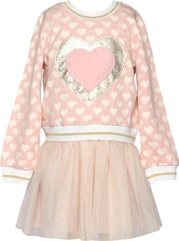 A sweater-knit bodice flares out into a tutu-inspired skirt on a mixed-media dress that your budding fashionista will love to style.