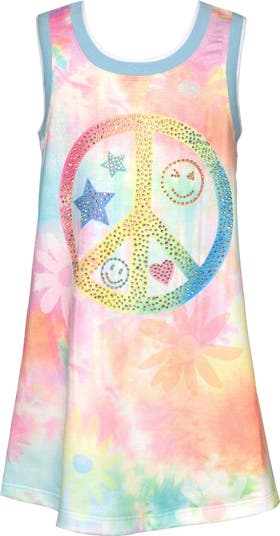 They'll spread smiles in style with this tie-dye dress featuring an embellished peace sign graphic.