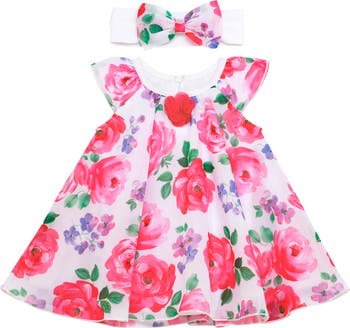 Baby will look as cute as can be in this chiffon dress with a built-in bodysuit and paired with a matching headband all covered in vibrant blooms.