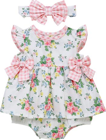 This adorable dress with a built-in bodysuit and paired with a matching headband features spring flowers and pretty bows.