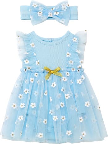 Pretty tulle printed with sparkly daisy overlays this rib-knit bodysuit that's paired perfectly with a matching head wrap.