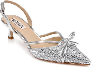 A jewel-encrusted bow enriches the vamp of an elegant slingback pump framed by a pointy toe and tapered heel.