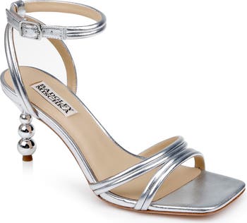 Polished orbs highlight the lofty heel of an ankle-strap sandal that's sure to stand out on your next special occasion.