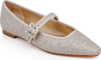 A sparkling buckle calls attention to the mary jane strap of this graceful square-toe flat.