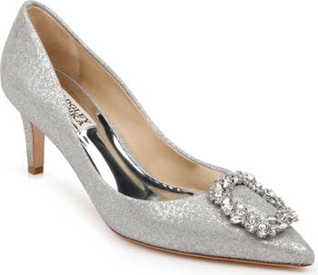 A gorgeous crystal brooch crowns the pointed toe of a glossy satin pump lifted by a tapered heel.