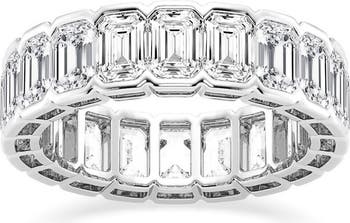 Available in a platinum or fine 14-karat gold setting, emerald-cut lab-created diamonds shine brilliantly from every angle of this infinity band ring.