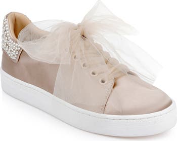 Sheer organza laces and pearly beads bring elegant allure to the satin upper of a day-to-night sneaker set on a chunky platform cupsole.