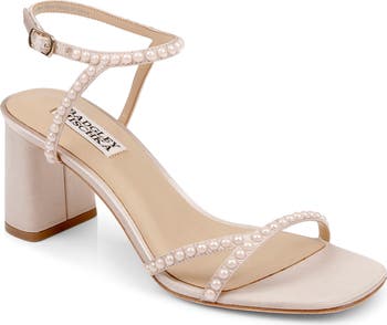 Pearly beads add glamorous luster to the asymmetric straps of a soirée-ready sandal set on a lightly padded footbed and wrapped demi heel.