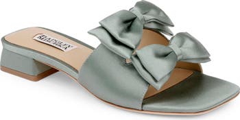 A duo of charming bows adorn an elegant slide sandal furnished with a cushioned footbed and set on a barely-there block heel.