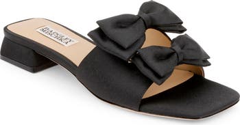 A duo of charming bows adorn an elegant slide sandal furnished with a cushioned footbed and set on a barely-there block heel.