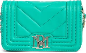 Chevron quilting adds trend-right styling to a crossbody bag complete with a shiny logo and a gleaming chain strap.