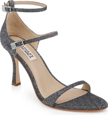 Rhinestone-encrusted buckles illuminate the slender ankle straps on a soirée-ready sandal set on a lightly padded footbed and tapered heel.
