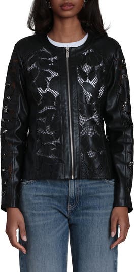 Welcome the changing seasons in this moto-style zip jacket, trimmed with embroidered lace panels with a shiny zip closure to frame this contemporary layer.