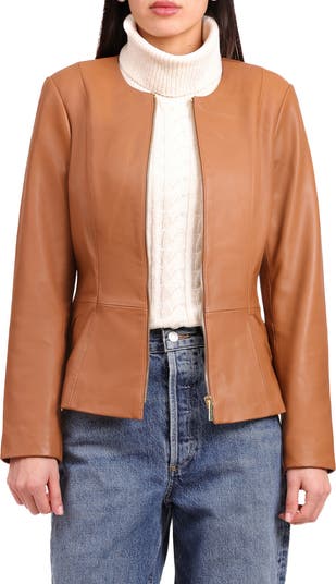 Sleek and sculpted, this leather jacket is a modern take on timeless tailoring. Designed with a flattering peplum silhouette, it contours the waist and flares subtly at the hem. The collarless neckline and clean zip front closure add a minimalist touch, while hardware at the sleeves provides a refined edge.