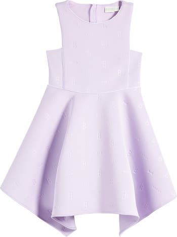 Subtle embossing details a party-ready scuba-crepe dress with a flouncy and fun handkerchief hem.