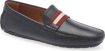 A striped penny keeper distinguishes the grained leather upper of a loafer that adds sophistication to casual or elevated looks.