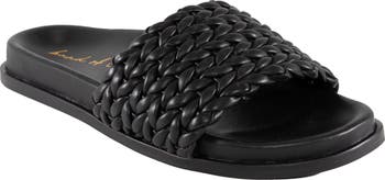 A lattice-woven strap bubbles atop the cushy contoured footbed of this elegant leather slide sandal with a naturally breathable lining and grippy rubber sole.
