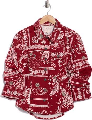 Scrunched sleeves and sparkly crystal baubles bring instant flair to this button-front shirt-jacket cut from cotton-blend twill with a bold bandana print.