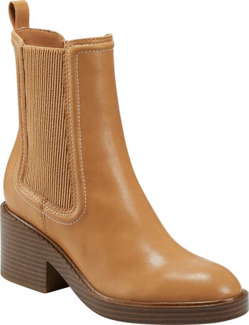 Side goring panels and a rear pull-tab lend classic elements to a polished Chelsea boot balanced by an almond toe and stacked block heel.