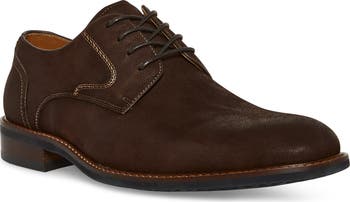 A sleek leather finish and plain toe add timeless sophistication to a handsome derby designed with subtle brogue perforations and a low, stacked heel.