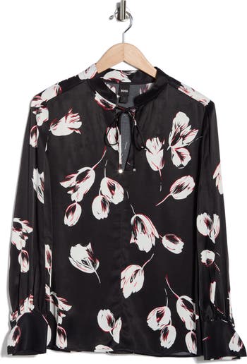 This woven long-sleeve top features a split neckline with adjustable ties and a tulip print, offering a lightweight look with an easy drape.